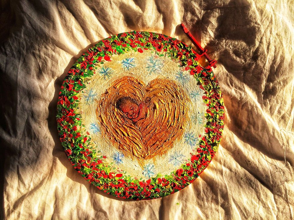 Jesus is that "Love Of God!" Born from the very yarn of "His Soul!" Who's only Joy; Was in spreading, living, giving, And "Being Divine-Love!" Hence today I share this wreath Of an Eternal Life! That May Gods Love make "Your Souls Ignite!" So much so that you too shall "Experience A Knowing!" That you aren't Separate, But are born from His light! For the love of our Beloved Father, "Is Unfathomable!" As every time he opens the sky And makes the snow-flakes fall Know! They aren't just some Crystals of Ice; But, "His Tears Of Joy!" "For His Beloved Son!" Who came down to share "The Eternal-Truth!" That, "I And You Are One!" (We are all born from the very same yarn of Gold called Love! Every Religion simply states this eternal truth, that we have come from God, irrespective of our bodily differences. We either act from this "Truth" or out of "Fear" for the other, based on ones race, colour, cast, religion & nationality. Through this work as an artist I wanted to interpret this message that we are all one body of God.) Painted on muslin cloth.
