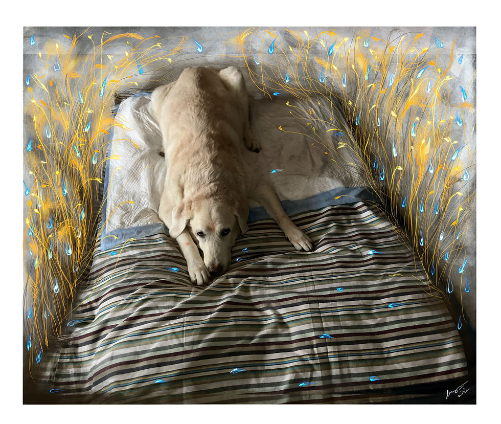 Art has many ways to express & it’s a beautiful journey with Swami, to express his love through colours. The self-portrait was taken, while Cocos blue in work was on the easel in the background. But to me in this collage it seems to float in Swamis light.